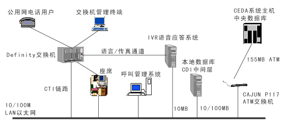 浦東機場呼叫中心系統(tǒng)建有本地數(shù)據(jù)庫,但有許多信息需與中央數(shù)據(jù)庫交換。所以依托高速的ATM主干網(wǎng)絡,利用基于TCP/IP網(wǎng)絡協(xié)議的CDI(CEDA Data Interface)通信方式作為中間件,進行本地數(shù)據(jù)庫與中央數(shù)據(jù)庫之間的信息交互和共享,完成本系統(tǒng)與機場信息集成系統(tǒng)的中央數(shù)據(jù)庫連通。