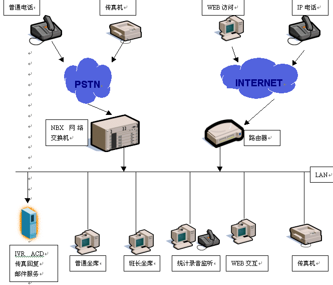 基于NBX的呼叫中心對(duì)外支持PSTN、IP兩種接入方式,可以實(shí)現(xiàn)各種接入:普通電話、傳真、IP電話、郵件、WEB訪問(wèn),NBX呼叫中心在技術(shù)上實(shí)現(xiàn)革命性的突破,在內(nèi)部實(shí)行語(yǔ)音數(shù)據(jù)兩網(wǎng)合一,將外部的模擬數(shù)據(jù)轉(zhuǎn)換為以太網(wǎng)數(shù)據(jù)包,由NV-ACD實(shí)現(xiàn)外部各種訪問(wèn)的統(tǒng)一路由分配。