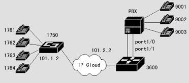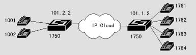 在該案例中,異地之間通過兩臺DCR 1750互連,并提供語音模塊,可直接接電話機,使得異地之間可以通過IP網絡撥打IP語音電話。