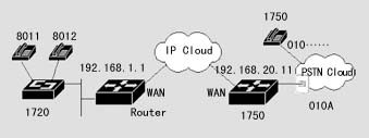 1720也可以通過器語音端口連接到PSTN,通過二次撥號,使得兩地的PSTN用戶可以通過IP網絡互相通話,而話費只是市話的費用。