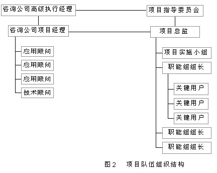 這支隊(duì)伍既有企業(yè)高級(jí)管理層所組成的指導(dǎo)委員會(huì)和咨詢(xún)公司人員,也有來(lái)自信息部門(mén)的技術(shù)人員和相應(yīng)職能部門(mén)的熟悉企業(yè)流程的業(yè)務(wù)人員所組成的實(shí)施小組和職能小組。項(xiàng)目隊(duì)伍組織結(jié)構(gòu)如圖2所示。