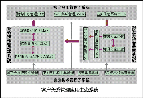 由上述四個(gè)子系統(tǒng)組成的客戶關(guān)系管理的生態(tài)系統(tǒng),基本的結(jié)構(gòu)和體系可如下圖所示: