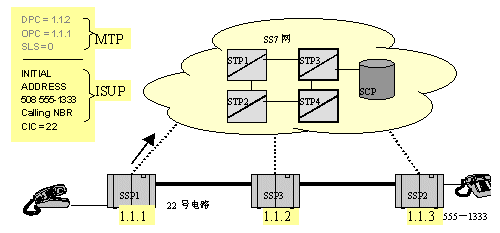 如下圖所示,當(dāng)一個(gè)用戶摘機(jī)并拔被叫號(hào)碼,交換局(SSP1)收集并分析被叫號(hào)碼,分析到被叫不是本局內(nèi)用戶,而是目的信令點(diǎn)編碼為1.1.3交換局的用戶,于是,SSP1在路由表中查找到達(dá)1.1.3的路由,然后用找到的鏈路把IAM消息發(fā)送出去,如圖中箭頭所示。