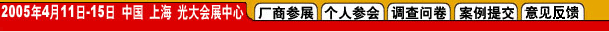 展覽大廳開放時(shí)間:2005年4月13日1:30pm —— 4月15日 03:30pm 注:以上日程內(nèi)容,將根據(jù)參展廠商提交資料的進(jìn)展情況隨時(shí)更新,敬請(qǐng)留意。