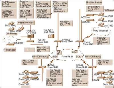 3524交換機(jī),它們能支持330多部思科IP 電話。各城市間的站點(diǎn)通過幀中繼WAN互相連接。在夏洛特斯維爾,3個(gè)基本速率接口(PRI)線路提供與公眾交換電話網(wǎng)(PSTN)的連接。由于SNL
