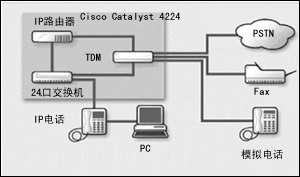 配置Catalyst 4224時,可將T1的WAN接口連接到Cisco 7200 VXR中心站點路由器,這個配置過程非常簡單。在以太網(wǎng)的接口之間,Spirent的SmartBits測試軟件表明24端口交換機可傳輸線速的流量。當設定Catalyst 4224利用PPP封裝與Cisco 7200 VXR路由器進行通信時,Catalyst 4224為IP電話的會話提供了QoS,這種會話通過以太網(wǎng)接口路由到WAN。Catalyst 4224具有模擬語音接口,可將H.323作為中間協(xié)議,8個接口被映射到CallManager的軟件中。Cisco Catalyst 4224將路由器、24端口交換機和TDM交換機集中于一個2U的機柜內(nèi)。
