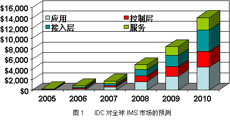 IMS作為一個(gè)通信架構(gòu),開(kāi)創(chuàng)了全新的電信商業(yè)模式,拓展了整個(gè)信息產(chǎn)業(yè)的市場(chǎng)空間。IMS正在成為新一輪的投資熱點(diǎn)。IDC認(rèn)為,IMS市場(chǎng)將從目前的數(shù)百萬(wàn)美元迅速增長(zhǎng)到2010年的141億美元(如圖1)。對(duì)于電信行業(yè)來(lái)說(shuō),IMS的意義甚至超出了3G或4G,它將重新定義未來(lái)的通信業(yè)務(wù)。