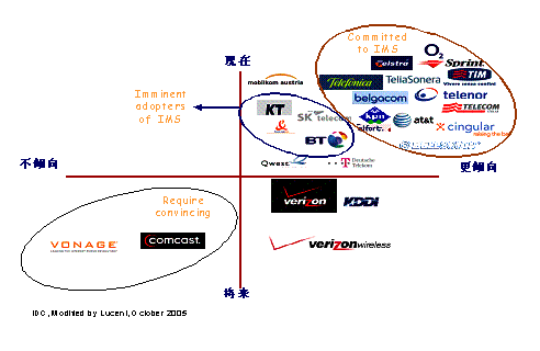 朗訊IMS融合解決方案的優(yōu)勢(shì)決定了其市場(chǎng)的領(lǐng)導(dǎo)地位,截至2006年24月,朗訊在全球已簽約77個(gè)IMS商用合同和77個(gè)試驗(yàn)合同。尤其是北美五大運(yùn)營(yíng)商(Cingular、Sprint、at&t、BellSouth、Verizon)中有4個(gè)已經(jīng)與朗訊簽訂了IMS
