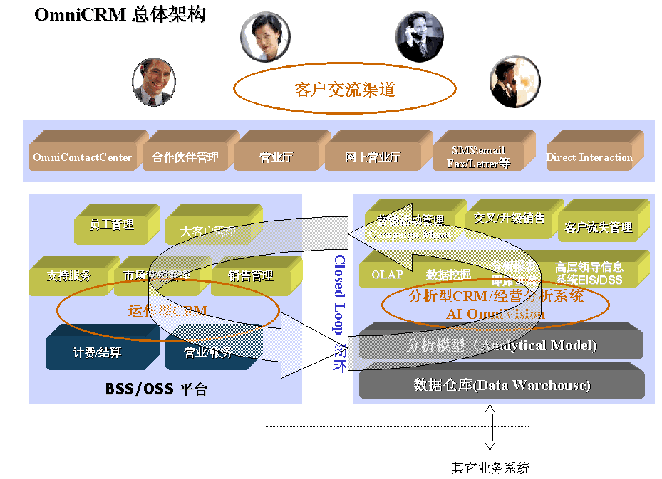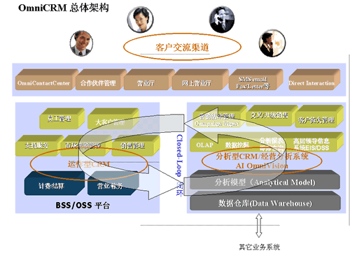 OmniCRM方案是亞信基于多年服務電信市場的豐富的行業(yè)經(jīng)驗,以及對國內(nèi)運營商業(yè)務發(fā)展的深刻認識而推出的,其中,AI OmniVision是OmniCRM方案中經(jīng)營分析型CRM 的核心產(chǎn)品。AI OmniVision不僅符合行業(yè)業(yè)務規(guī)范,而且基于對客戶行為、競爭環(huán)境,商業(yè)獲利率以及其他參數(shù)的透徹分析,能夠使運營商充分了解現(xiàn)有客戶、識別并關注贏利的客戶組、提高服務質(zhì)量、確?蛻魸M意度和忠誠度;同時吸引潛在的客戶;加強提供新服務的投資回報率;提高效率、減小成本,以實現(xiàn)業(yè)務價值的最大化。AI OmniVision采用數(shù)據(jù)倉庫、ETL、OLAP分析、靈活報表展現(xiàn)及數(shù)據(jù)挖掘等技術,包含了用戶分析、業(yè)務分析、收益分析、大客戶分析、營銷分析、競爭分析、服務質(zhì)量、新業(yè)務分析等眾多功能模塊。