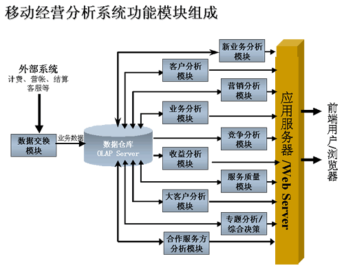 根據(jù)中國移動的業(yè)務特征,AI OmniVision分為用戶分析、業(yè)務分析、收益分析、大客戶分析、營銷分析、競爭分析、服務質(zhì)量分析和綜合決策分析。同時在系統(tǒng)中還需要一些輔助模塊,以保證系統(tǒng)正常順利地運行。這些輔助模塊包括: