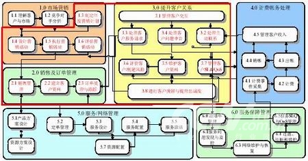 AIOpenCRM將重點(diǎn)支持客戶/市場(chǎng)層面的服務(wù)開(kāi)通、服務(wù)保障的內(nèi)容,具體包含了市場(chǎng)營(yíng)銷(xiāo)、銷(xiāo)售及訂單管理、提升客戶關(guān)系、計(jì)費(fèi)帳務(wù)處理、服務(wù)開(kāi)通管理、服務(wù)報(bào)障管理這六個(gè)高層流程的前三個(gè)。如下圖: