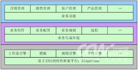 AIOpenCRM的底層技術(shù)框架不僅僅可以使用AIAppFrame提供的各種工具,而且可以使用第三方的應(yīng)用中間件產(chǎn)品,如工作流方面使用Bea的WLI或者IBM的MQ WorkFlow。