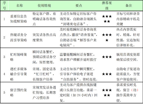 。1)策略內(nèi)容:在IVR主干語音提示客戶話務(wù)繁忙基礎(chǔ)上,增加“多媒體自助渠道引導(dǎo)”,并下發(fā)短信提示客戶如何使用。如:尊敬的客戶,目前人工話務(wù)繁忙,為節(jié)省您的時(shí)間,建議您登陸gd.10086.cn或wap.10086.cn或發(fā)送短信10086到10086,更多自助服務(wù)期待您精彩體驗(yàn)。