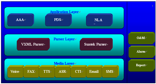 Layer提供具體的操作,主要是管理語音、傳真、IP等資源,對(duì)Browser Layer屏蔽掉硬件的區(qū)別,提供統(tǒng)一的接口,以插件的形式提供各種功能。在它們之外還有配置管理、維護(hù)監(jiān)控、告警管理、統(tǒng)計(jì)報(bào)表等。應(yīng)用服務(wù)器部分包括外呼管理、數(shù)據(jù)庫中間件,傳真網(wǎng)關(guān)、自然語音理解引擎等。具體的結(jié)構(gòu)見下圖: