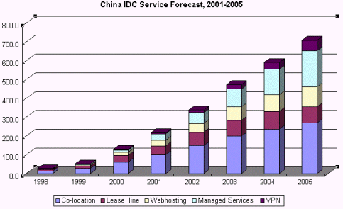 Frost & Sullivan研究表明,在2000年,中國(guó)IDC市場(chǎng)規(guī)模約為1億2千萬美圓,預(yù)測(cè)到2005年,將達(dá)到7億美圓。從2000年到2005年間,中國(guó)IDC市場(chǎng)的年平均復(fù)合增長(zhǎng)率將達(dá)42.3% 。