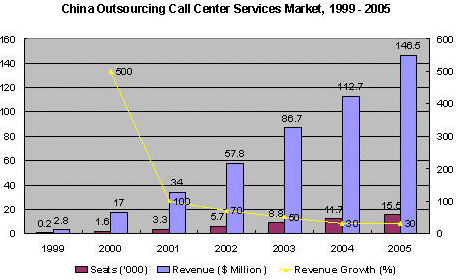 Frost & Sullivan公司研究表明在2000年,中國外包呼叫中心服務(wù)市場價值1700萬美元,共有1600坐席。本座席數(shù)是按照實(shí)際工作量來計(jì)算的,物理上存在的坐席數(shù)要超過2300個。因?yàn)樵S多坐席是在2000年下半年末才建成投入使用的,并且工作任務(wù)也沒有滿負(fù)荷。