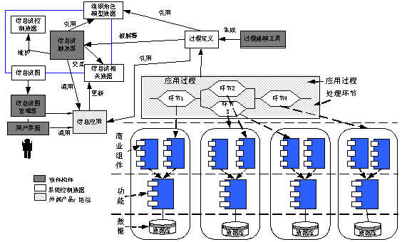 一體化信息平臺(tái)的總體結(jié)構(gòu)大體上分為數(shù)據(jù)層、功能、商業(yè)組件、處理環(huán)節(jié)、應(yīng)用過(guò)程層,功能層提供基本的基礎(chǔ)功能和商業(yè)功能元件,商業(yè)組件封裝了相關(guān)的數(shù)據(jù)和功能元件,可以被客戶(hù)關(guān)系管理系統(tǒng)各環(huán)節(jié)調(diào)用,通過(guò)以客戶(hù)為中心的信息流管理控制順序執(zhí)行處理環(huán)節(jié),實(shí)現(xiàn)商業(yè)過(guò)程。