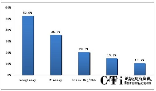 如圖1所示,在用戶(hù)占有方面,使用率最高的是谷歌的Googlemap,總計(jì)有52.6%的用戶(hù)使用該軟件;其次是高德的迷你地圖,使用率達(dá)35.8%,排名第二;Nokia