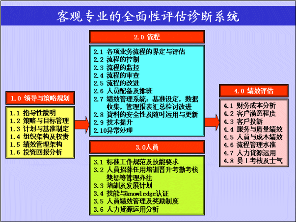 此評估診斷系統(tǒng)以1.0領(lǐng)導與決策規(guī)劃為起始點,作為建立一個以客戶為核心的高質(zhì)量客戶服務中心的推動根源,并且制定了一個良好的4.0績效評估系統(tǒng),以確保經(jīng)營目標與標準質(zhì)量基準能確實達成,此過程需透過嚴謹?shù)牧鞒淘O計和高效的人員管理去執(zhí)行這套運營體系。