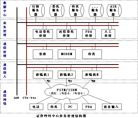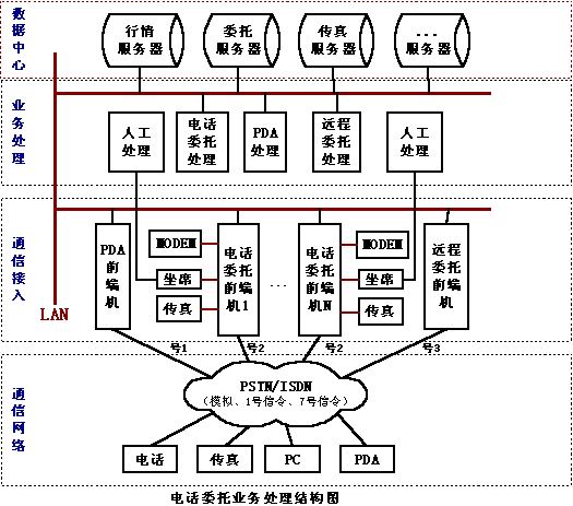 另一種方案是PDA和證券營(yíng)業(yè)部前端機(jī)(實(shí)際就是電話委托前端機(jī))采用FSK通訊方式,使用電話委托的通道來(lái)完成所有的委托查詢。這種方式的速度快,信息容量大,保密性強(qiáng),而且營(yíng)業(yè)部不需單獨(dú)申請(qǐng)電話線路,PDA和電話委托線路可動(dòng)態(tài)分配,使其電話線路得到最大限度的利用。另外,營(yíng)業(yè)部對(duì)外形象也好,只用一個(gè)號(hào)碼就可讓股民完成電話委托、PDA委托等多種委托方式,給股民帶來(lái)了方便。不過這種方式需要得到電話語(yǔ)音卡提供廠商的產(chǎn)品技術(shù)支持,語(yǔ)音卡必須同時(shí)支持標(biāo)準(zhǔn)的DTMF和FSK的方式,卡上有充足的能力來(lái)處理兩種方式,在語(yǔ)音處理卡的底層驅(qū)動(dòng)應(yīng)該將電話和PDA的委托區(qū)別開來(lái),目前市場(chǎng)能夠完全支持這種應(yīng)用的只有深圳市東進(jìn)通訊技術(shù)股份有限公司的產(chǎn)品,東進(jìn)技術(shù)的新一代PCI系列語(yǔ)音卡數(shù)字卡和模擬卡都完全采用DSP(數(shù)字信號(hào)處理器)架構(gòu),卡上有專用DSP來(lái)處理DTMF和FSK的收發(fā),是目前PDA委托前端的最好選擇;這種方案還應(yīng)該得到證券電話委托系統(tǒng)的開發(fā)商的支持,在電話委托系統(tǒng)里增加處理PDA委托的功能。目前恒基偉業(yè)的“股靈通”就是采用這種方式。
