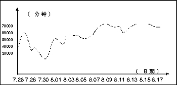 延吉通信從7月10日開始正式作宣傳,8月1日后每天時長均保持在55000分鐘以上。最新統(tǒng)計表明,自2002年7月至今,該業(yè)務已為延吉通信公司創(chuàng)造2500萬分鐘以上的市話增值。