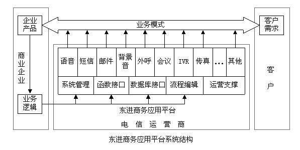 從應(yīng)用角度看,東進(jìn)商務(wù)應(yīng)用平臺(tái)將業(yè)務(wù)分為3個(gè)部分--企業(yè)端的業(yè)務(wù)邏輯、電信運(yùn)營(yíng)商端的業(yè)務(wù)實(shí)現(xiàn)和客戶(hù)端業(yè)務(wù)響應(yīng)。企業(yè)根據(jù)其產(chǎn)品特點(diǎn),制定相應(yīng)的業(yè)務(wù)邏輯,去控制電信運(yùn)營(yíng)商的商務(wù)應(yīng)用平臺(tái),平臺(tái)在業(yè)務(wù)邏輯的控制下,去響應(yīng)客戶(hù)端的業(yè)務(wù)需求,由此組成一個(gè)智能化的業(yè)務(wù)模式。