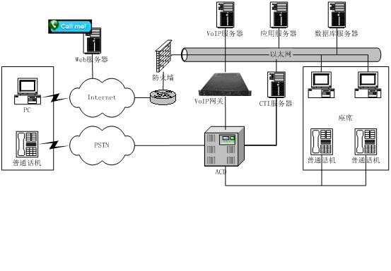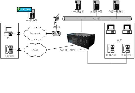 相對(duì)于傳統(tǒng)以PSTN網(wǎng)接入的呼叫中心,東進(jìn)互聯(lián)網(wǎng)呼叫中心增加了系統(tǒng)與Internet的接入,將原來由IVR完成的操作通過Web頁面上的流程實(shí)現(xiàn),這樣用戶通過下拉菜單、簡(jiǎn)單填寫、點(diǎn)擊按鈕等操作完成客戶識(shí)別、業(yè)務(wù)識(shí)別等操作,這些流程完成后,通過VoIP對(duì)呼叫中心呼入,由呼叫中心對(duì)呼入進(jìn)行受理,再按照相應(yīng)的原則分配到座席,座席再作相應(yīng)的應(yīng)答和處理,從而為客戶提供了一個(gè)通過Web站點(diǎn)直接進(jìn)入呼叫中心的途徑,把Internet所具有的豐富信息資源和強(qiáng)大的功能賦予呼叫中心,它向客戶提供一個(gè)可訪問的Web站點(diǎn),使得呼叫中心從“撥叫到交談(Dial