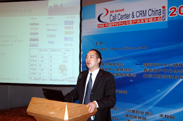 2006年4月3日至5日,2006中國呼叫中心與客戶關(guān)系管理大會在北京國際會議中心隆重召開,以下是星際網(wǎng)絡(luò)的執(zhí)行副總裁柳國東專題演講實錄: 第一個特點就是我們提出來了一個全程一體化的服務(wù)解決方案。整個解決方案有三個層面,第一個層面就是我們要和企業(yè)一起建設(shè)一個適用的呼叫平臺。現(xiàn)在我們企業(yè)在選擇建立呼叫中心的時候也有一些困惑,比如說我要建設(shè)一個30個坐席的呼叫中心,可能很多集成商的方案和報價從20萬到100萬都有,現(xiàn)在各個呼叫中心的平臺都已經(jīng)很成熟了,但是作為企業(yè)來講,要選擇一個適合自己的呼叫中心,而不是選擇昂貴的或者是低廉的。我們建立呼叫中心以后可以進行高效率的電話接聽和服務(wù)人員的管理平臺。但是并不能解決我們服務(wù)的流程管理、流程監(jiān)控。咨詢的結(jié)果我們并沒有因為建立呼叫中心就把問題解決了。所以我們星際網(wǎng)絡(luò)提出了服務(wù)應(yīng)用的概念。一般來說現(xiàn)有的企業(yè)大概的服務(wù)方式有兩種,那么星際網(wǎng)絡(luò)根據(jù)這兩種不同的服務(wù)模式,我們也提供了相應(yīng)的服務(wù)應(yīng)用。我們希望通過一個前臺高效的服務(wù)中心平臺,和后臺一個豐富的系統(tǒng)應(yīng)用,真正幫助企業(yè)解決完成的客戶流程。