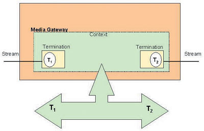 H.248工作在主從模式,并定義了連接模型(參見圖2)。連接模型中有終端、流以及上下文。終端是出/入分組網(wǎng)絡(luò)的媒體流的連接,它允許信號應(yīng)用到媒體流上,如發(fā)送忙音; 也允許從媒體流中接受發(fā)生的事件,如收到DTMF信號。上下文則是將終端上媒體流混合并橋接在一起,并描述媒體流之間的關(guān)系。