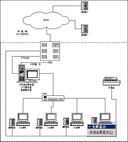 系統(tǒng)目前共設(shè)置了多個人工座席,每個人工座席有電腦一臺,耳機式電話一部。人工座席的電腦與CTI,IVR語音服務器及數(shù)據(jù)庫服務器共處一個局域網(wǎng)內(nèi)。