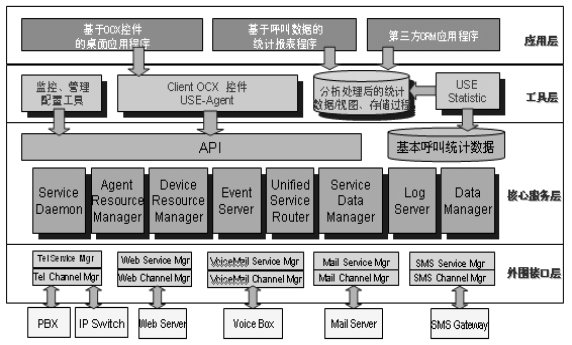 青牛USE從體系結(jié)構(gòu)上分為四個(gè)層次。第一層為外圍接口層,負(fù)責(zé)接入、抽象和發(fā)布來自不同渠道的服務(wù)請(qǐng)求;第二層是核心服務(wù)層,它是青牛USE軟件的核心部分,對(duì)來自不同渠道的服務(wù)請(qǐng)求和服務(wù)回復(fù)進(jìn)行統(tǒng)一的服務(wù)排隊(duì)管理、資源調(diào)度管理、日志數(shù)據(jù)管理等,屏蔽了不同渠道的物理特性,真正實(shí)現(xiàn)統(tǒng)一路由、統(tǒng)一管理;第三層是工具層,是青牛USE提供給應(yīng)用開發(fā)商和集成商的開發(fā)接口和配置工具;第四層,USE產(chǎn)品的應(yīng)用層,為呼叫中心應(yīng)提供應(yīng)用功能,比如:呼叫統(tǒng)計(jì)分析、呼叫監(jiān)控等。