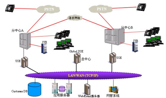 如圖所示,分布式應(yīng)用模式下,各分支節(jié)點(diǎn)的USE負(fù)責(zé)本地的呼叫控制和分配,Global USE負(fù)責(zé)呼叫在不同分支點(diǎn)之間的互專和數(shù)據(jù)控制。