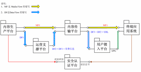 系統(tǒng)根據(jù)功能可分成內(nèi)容制作、節(jié)目傳輸、安全認證、計費營業(yè)、接入處理和終端六個部分。整個系統(tǒng)始終貫穿媒體流和數(shù)據(jù)流,確保各個部分能夠有效的協(xié)作。