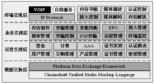 整個(gè)運(yùn)營(yíng)平臺(tái)分成內(nèi)容生產(chǎn)、傳輸和運(yùn)營(yíng)支撐,可以支持STB、智能手機(jī)以及PC,可以支持的傳輸網(wǎng)絡(luò)包括ADSL、GRPS、Ethernet和Internet。