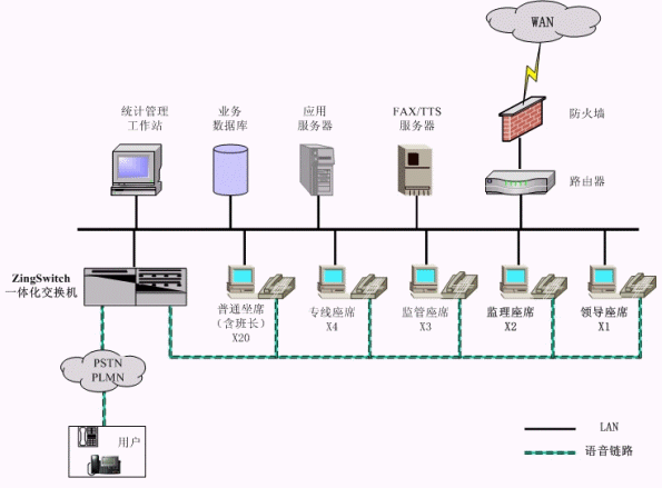 系統配置一套英立訊的ZingSwitch一體化交換機,集成提供了包括PABX、ACD、CTI Server、IVR Server、實時錄音等功能,同時配置外掛的傳真服務器。同時,系統根據需求配置相應數量的各種座席和統計管理工作站等。