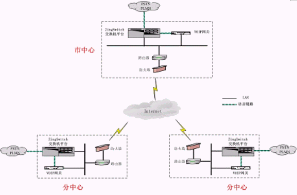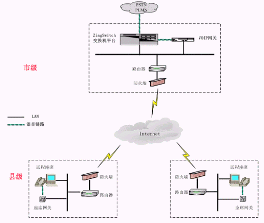 系統在市中心點和分布的遠程座席所在縣市區(qū)分別部署相應的VoIP網關,市中心和各個縣市區(qū)都通過互聯網進行連接和語音傳輸,客戶與遠程座席之間的交流與普通的集中座席員之間毫無區(qū)別,遠程座席只相當于ZingSwitch交換機的一個遠程分機。