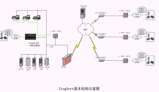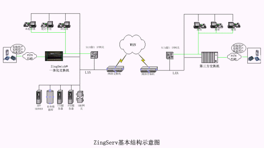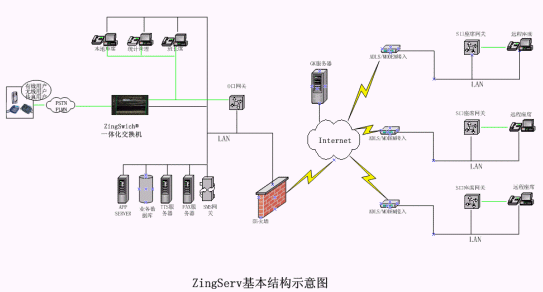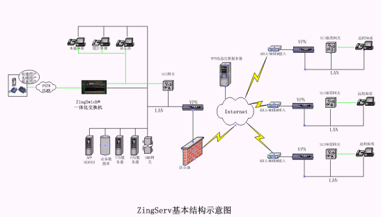 硬件:坐席集中的中心點都有ZingSwitch®交換機,S口網(wǎng)關(guān)和CO8卡或E1接口網(wǎng)關(guān)和E1卡。VPN動態(tài)注冊服務(wù)器和VPN設(shè)備,或GK服務(wù)器。