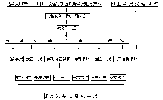 本系統(tǒng)充分借助計算機及通迅線路的優(yōu)勢,將高度普及的電話線路,同高科技的計算機處理緊密結(jié)合起來,通過電話語音這一人類最易溝通交流的途徑和手段,將檢舉人和檢察院緊密結(jié)合起來。檢舉人通過簡單的拔通服務(wù)電話,使用電話按鍵,利用自動語音導(dǎo)航和人工服務(wù),實現(xiàn)以上熱線投訴舉報的自動咨詢及人工服務(wù)的各項功能。
