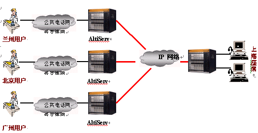 奧迪堅分布式呼叫中心方案可以分為多對多(圖1)和多對一(圖2)兩種形式,但都能夠為用戶提供本地呼叫,異地服務(wù)的功能。各個服務(wù)點之間是對等關(guān)系或隸屬關(guān)系,它們分布于不同的地理位置,在運作時間、資源、功能上互相協(xié)作,為用戶提供最大限度的服務(wù)。如果基于奧迪堅通訊系統(tǒng)的分布式呼叫中心,用戶在北京,廣州或蘭州的任何一個地方撥打本地的服務(wù)電話,都可以通過IP網(wǎng)絡(luò),自動路由到上海的坐席,由上海的坐席來為用戶提供統(tǒng)一的服務(wù),此謂多對一模式。如果北京、上海或廣州的用戶撥打本地電話后,系統(tǒng)經(jīng)過網(wǎng)絡(luò)排隊和自動路由,被分配到三個城市中任意一個正在空閑的或正適合此項服務(wù)的坐席,此謂多對多。