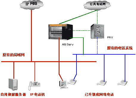 如果您的交換機不是很大,我們建議您用奧迪堅高度整合的通訊服務器Altiserv來替代原有的交換機,直接接入公共電話網(wǎng)。 如果您不想放棄原來的交換機,也可以將Altiserv接入用戶交換機的輸出端,在這種方案下,原有分機依然保留,原有布線不用改變,但是原有分機電話已經(jīng)升級為網(wǎng)絡電話。(綠色虛線為仍保留原來交換機的聯(lián)接方案)