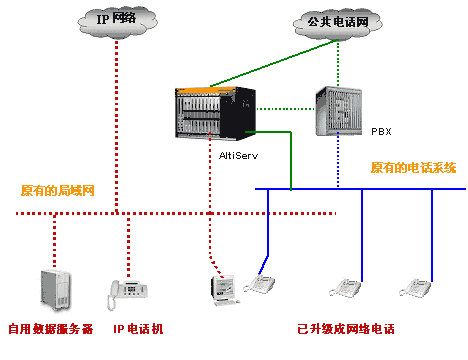 如果您的企業(yè)規(guī)模不是很大,原有的交換機(jī)投資不大,我們建議您用奧迪堅(jiān)的Altiserv來(lái)替代原有的交換機(jī)。當(dāng)然也可保留原有交換機(jī),將Altiserv作后端設(shè)備。
