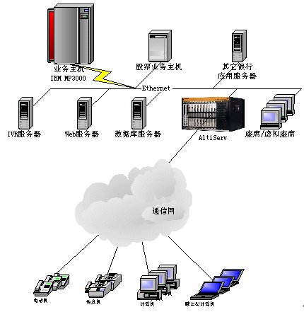 。。目標(biāo)是建立一個功能完善的客戶服務(wù)中心,涵蓋自動語音應(yīng)答(IVR)、人工座席、WEB呼叫、客戶資料查詢統(tǒng)計以及與現(xiàn)有的銀行其他業(yè)務(wù)系統(tǒng)的結(jié)合。整個系統(tǒng)采用奧迪堅呼叫中心系統(tǒng)AltiCenter,系統(tǒng)以一個特定號碼xxxxx作為呼叫中心的系統(tǒng)號碼(也可提供多個電話號碼),集中受理客戶的業(yè)務(wù)需求,為客戶提供綜合性服務(wù)。它能與Internet、資料庫系統(tǒng)很好地集成,實(shí)現(xiàn)資料共用和各種其他不同的業(yè)務(wù)功能。