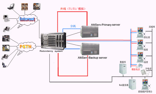 奧迪堅(jiān)通訊系統(tǒng)有限公司作為CTI通訊平臺(tái)的提供商,在技術(shù)上不斷創(chuàng)新,對(duì)產(chǎn)品精益求精,尤其體現(xiàn)在對(duì)系統(tǒng)的運(yùn)行安全性的要求上,為了防止電信接入設(shè)備或者企業(yè)網(wǎng)絡(luò)出現(xiàn)故障而造成的呼叫中心服務(wù)中斷,奧迪堅(jiān)呼叫中心系統(tǒng)提供安全保護(hù)冗余切換系統(tǒng),來保障呼叫中心在意外情況下的正常工作,該安全冗余切換系統(tǒng)通過對(duì)電源、T1/E1、模擬trunk、分機(jī)座席、以及各種網(wǎng)絡(luò)鏈路串口等備份切換來實(shí)現(xiàn)可靠的運(yùn)行。除此之外,奧迪堅(jiān)系統(tǒng)本身也提供強(qiáng)大的安全保障,由于采用先進(jìn)IP內(nèi)核一體化設(shè)計(jì),集傳統(tǒng)PBX、CTI服務(wù)器、IVR、ACD、Recording、FAX等眾多設(shè)備于一體,這樣有效的避免了因?yàn)橥鈷煸O(shè)備過多以及設(shè)備供應(yīng)商的不同而存在的兼容性的問題,從而降低了給呼叫中心系統(tǒng)帶來的的不穩(wěn)定的安全隱患。在系統(tǒng)之外依靠安全保護(hù)冗余切換系統(tǒng),可以實(shí)現(xiàn)外線、分機(jī)、以及各種鏈路接口的雙倍安全運(yùn)行。如上圖所示:兩臺(tái)奧迪堅(jiān)的呼叫中心服務(wù)器和奧迪堅(jiān)安全冗余切換系統(tǒng)構(gòu)成呼叫中心熱備份系統(tǒng),在兩臺(tái)服務(wù)器中安裝所有的呼叫中心功能模塊。通常情況下由主呼叫中心服務(wù)器提供系統(tǒng)的正常運(yùn)行,備份服務(wù)器通過安全保護(hù)冗余切換系統(tǒng)的服務(wù)監(jiān)測模塊來監(jiān)測主服務(wù)器的各項(xiàng)設(shè)備和鏈路的使用情況,當(dāng)主服務(wù)器遭遇突發(fā)故障不能繼續(xù)工作時(shí),系統(tǒng)馬上實(shí)施自動(dòng)切換,就會(huì)通過安全保護(hù)冗余切換系統(tǒng)將系統(tǒng)切換到備份的呼叫中心系統(tǒng)上來,此鏈路可以是數(shù)據(jù)、語音、網(wǎng)絡(luò)、串口等。當(dāng)安全保護(hù)冗余切換系統(tǒng)自身出現(xiàn)斷電或者其他故障時(shí),所有鏈路均保持正常工作狀態(tài)。