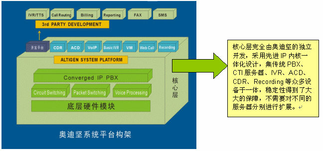 值得一提的是,在穩(wěn)定性上,奧迪堅(jiān)IP一體化呼叫中心平臺(tái)系統(tǒng)構(gòu)架,從產(chǎn)品設(shè)計(jì)之初就突破了以住基于交換機(jī)或板卡的傳統(tǒng)模式,在一臺(tái)通訊服務(wù)器上高度融合了呼叫中心的所有常用功能,有效避免了復(fù)雜的網(wǎng)絡(luò)連接和眾多的各類交換機(jī)和外掛設(shè)備,各個(gè)設(shè)備相對(duì)獨(dú)立兼容性差所給呼叫中心系統(tǒng)所帶的穩(wěn)定性欠佳的隱患。除此之外,奧迪堅(jiān)呼叫中心系統(tǒng)底層硬件模塊是在美國(guó)設(shè)計(jì)生產(chǎn)的,通過(guò)北美和中國(guó)的嚴(yán)格的電信入網(wǎng)測(cè)試;相對(duì)于硬件,平臺(tái)軟件也都是由奧迪堅(jiān)自主開(kāi)發(fā)設(shè)計(jì)的,針對(duì)不同的硬件采用不同的驅(qū)動(dòng)模塊,軟硬一體在交換層又使用統(tǒng)一的邏輯接口,結(jié)構(gòu)清晰,層次合理,不僅保障了穩(wěn)定而且便于擴(kuò)展(如下圖所示),整個(gè)系統(tǒng)作為一個(gè)整體統(tǒng)一擴(kuò)展,不需要對(duì)不同的服務(wù)器分別進(jìn)行擴(kuò)展,有效避免了傳統(tǒng)呼叫中心構(gòu)建方式在擴(kuò)展方面存在的復(fù)雜性問(wèn)題以及高額的擴(kuò)展費(fèi)用。