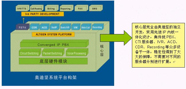選用美國奧迪堅一體化的硬件和系統(tǒng)軟件的平臺AltiServ 。AltiServ 是整個報業(yè)熱線綜合服務(wù)系統(tǒng)的心臟,是系統(tǒng)一切功能的基礎(chǔ),其從產(chǎn)品設(shè)計之初就突破了以住基于交換機或板卡的傳統(tǒng)模式,在一臺通訊服務(wù)器上高度融合了呼叫中心的所有常用功能,有效避免了復雜的網(wǎng)絡(luò)連接和眾多的各類交換機和外掛設(shè)備,各個設(shè)備相對獨立兼容性差所給呼叫中心系統(tǒng)所帶的穩(wěn)定性欠佳的隱患。除此之外,奧迪堅呼叫中心系統(tǒng)AltiServ?底層硬件模塊是在美國設(shè)計生產(chǎn)的,通過北美和中國的嚴格的電信入網(wǎng)測試;相對于硬件,平臺軟件也都是由奧迪堅自主開發(fā)設(shè)計的,針對不同的硬件采用不同的驅(qū)動模塊,軟硬一體在交換層又使用統(tǒng)一的邏輯接口,結(jié)構(gòu)清晰,層次合理,不僅保障了穩(wěn)定而且便于擴展。