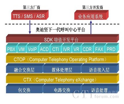 奧迪堅 IP 呼叫中心平臺的 CTOP(Computer Telephony Operating Platform) 核心技術(shù)架構(gòu)為業(yè)界最領(lǐng)先的融合交換、媒體處理和語音接入三層平臺應(yīng)用架 構(gòu)。值得一提的是,這一應(yīng)用架構(gòu)不僅僅針對交換機部分,而是針對呼叫中心的 PBX、ACD、CTI、IVR、錄音等所有核心功能。它們互相協(xié)同工作、有機整合, 以融合型和分布式的技術(shù)優(yōu)勢實現(xiàn)了呼叫中心應(yīng)用所需要的各種豐富的功能。