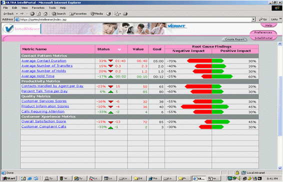 IntelliMiner使用專利的數(shù)據(jù)挖掘技術(shù),自動分析導致呼叫中心關鍵行為指標(KPI)和呼叫中心設定目標的因素及其關系和影響。所分析的數(shù)據(jù)揭示了導致呼叫中心KPI表現(xiàn)的潛在原因,例如過長的通話時間,過多的轉(zhuǎn)接次數(shù),過長的保持時間,降低生產(chǎn)力和降低客戶滿意度。針對分析的結(jié)果,用戶可以去回放相關的呼叫,找到導致這些因素的原因所在。
