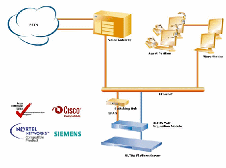 ULTRA平臺的VoIP錄音方案可真正實現(xiàn)純軟件解決方案,可由客戶自行配置符合要求的錄音服務器,安裝ULTRA平臺的軟件即可。另外,對于不能提供具備SPAN功能的網(wǎng)絡使用環(huán)境,ULTRA平臺也可提供相應的模塊產(chǎn)品(ULTRA