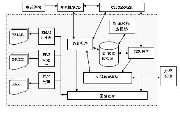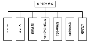 客戶服務(wù)中心系統(tǒng)由智能排隊機(含接入服務(wù)器)、核心服務(wù)器CTI、交互式語音應(yīng)答系統(tǒng)IVR、語音傳真服務(wù)器、業(yè)務(wù)服務(wù)器、工作流服務(wù)器、數(shù)據(jù)庫服務(wù)器、Internet/Intranet服務(wù)器、人工座席、尋呼機接口、手機短消息接口等組成。