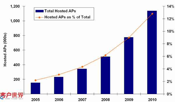 根據datamonitor在2006年的分析,自2005年起,全球呼叫中心托管的總數(shù)約二十萬個座席,占全球呼叫中心的總座席數(shù)得2%,到2008年成長到約五十萬個座席,占總量的6%左右,在2010年時更會成長到超過一百萬個座席占總數(shù)的10%左右。所以整個托管市場來說將會持續(xù)不斷的成長(見圖二)。